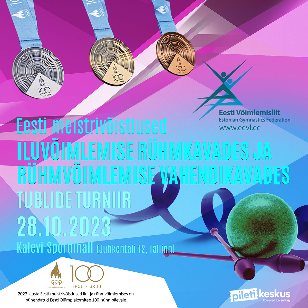 28. oktoobril toimuvad selle aasta viimased võimlemisalade Eesti meistrivõistlused, mis on pühendatud Eesti Olümpiakomitee 100. sünnipäevale. Sel korral teenivad Eesti parimad võimlejad iluvõimlemise rühmkavades ja rühmvõimlemise vahendiga kavades EOK 100 erikujundusega Eesti meistrivõistluste medalid.